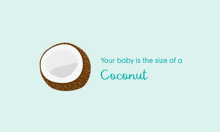 Baby has been in a curled up position for a few weeks now. He or she will put on another 900 g (2 lb) this month and will be ready for a face-to-face meeting in just nine weeks.